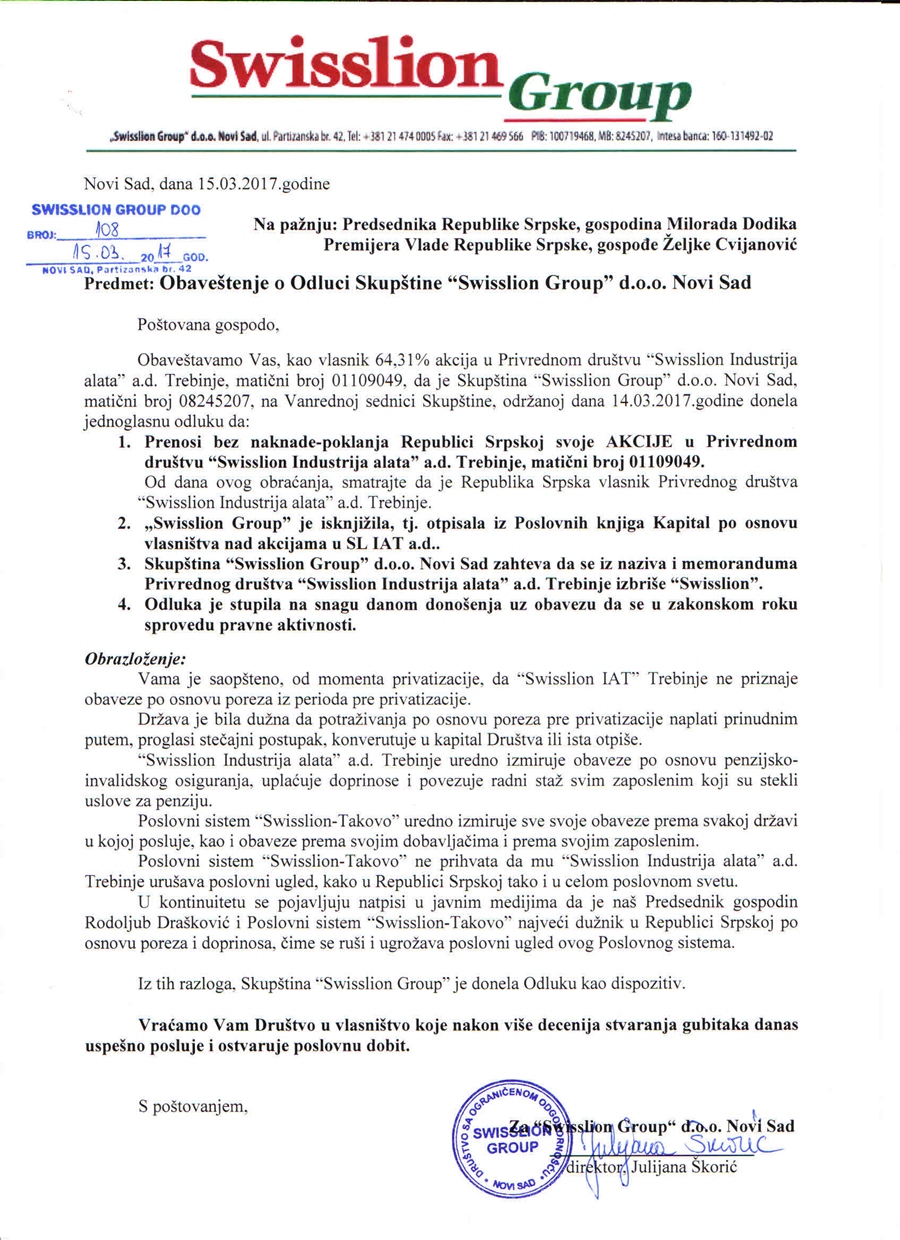 „Од дана овог обраћања сматрајте да је Република Српска власник Привредног друштва Свислајон Индустрија алата“, стоји у обавјештењу упућеном „на пажњу“ предсједнику РС Милораду Додику и премијерки Жељки Цвијановић.