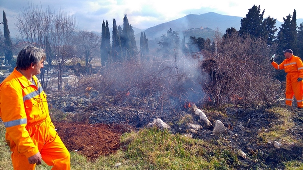 Цивилна заштита града Требиња, у сарадњи са Одјељењем за стамбено-комуналне послове, провела је данас акцију уклањања отпада и дивљег растиња са јавних површина на потезу од раскрснице за Горицу дуж ивице градског гробља.