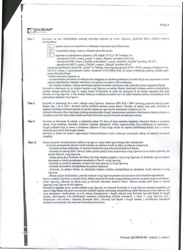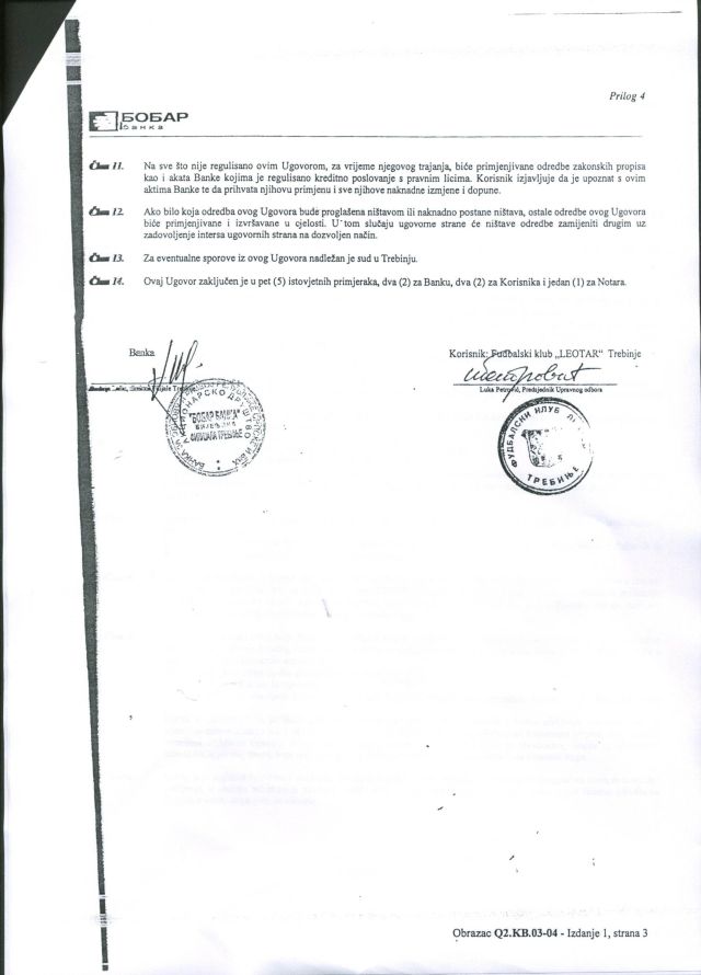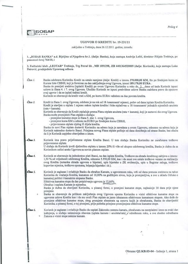 Ovim putem javnosti stavljamo na uvid Ugovor o kreditu kojim je pod hipoteku založen fudbalski stadion "FK Leotar" sa pratećim objektima i zemljištem i to za kreditni iznos od 370.000 KM. Potpisnici ugovora su s jedne strane "FK Leotar" koga zastupa Luka Petrović, a s druge Bobar Banka. Ugovor jasno upućuje na nekontrolisane radnje tadašnje uprave "FK Leotar", na čelu sa Lukom Petrovićem, današnjim poslanikom u NSRS i predsjednikom GO SNSD, koji je tada protivzakonito založio stadion uprkos činjenici da je "FK Leotar" imao pravo korišćenja stadiona, ali ne i pravo vlasništva, jer je stadion isključivo vlasništvo Grada Trebinje. Jasno je da je urušavanje trebinjskog Fudbalskog kluba "Leotar" i trebinjskog sporta rezultat ovakvih i sličnih malverzacija nekadašnje SNSD-ove strukture vlasti u Trebinju, ali ovdje u oči upada i naročita sprega SNSD - BOBAR BANKA, što je evidentno i iz proloženog ugovora.