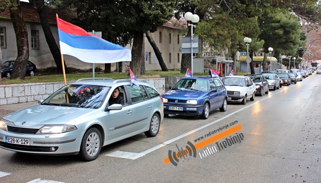 ТРЕБИЊЕ │ Више стотина аутомобила са заставама Републике Српске, у колони дугој неколико километара, прошло је данас уз звуке сирена градским улицама и приградским насељима Требиња, обиљеживши на овај начин Дан и крсну славу Републике Српске.