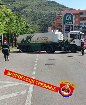 Vatrogasci su u saradnji sa policijom obezbijedili mjesto nezgode i ostali su u blizini zbog mogućeg curenja cisterne.