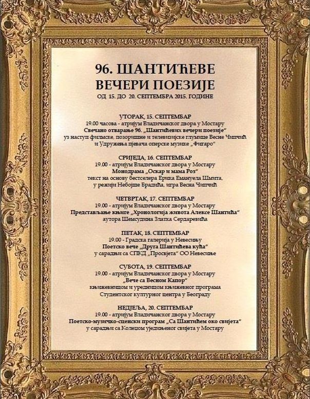 НЕВЕСИЊЕ │ Наступом српске филмске, позоришне и телевизијске глумице Весне Чипчић и Удружења оперских пјевача из Бањалуке "Фигаро" у уторак, 15. септембра, биће свечано отворене 96. "Шантићеве вечери поезије" у Владичанском двору у Мостару.