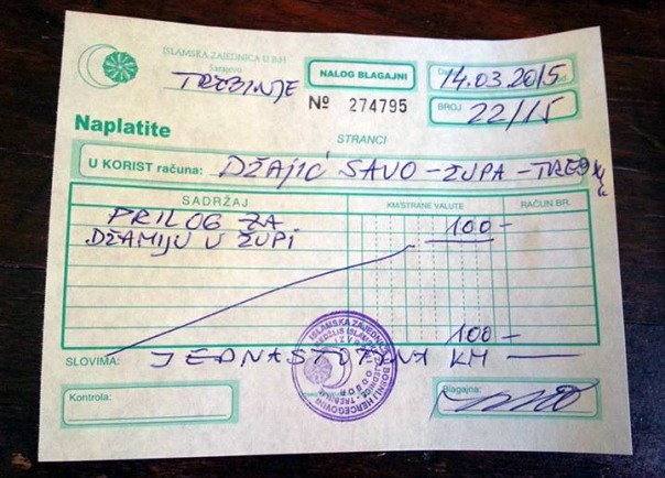 TREBINJE | Savo Džajić iz Župe kod Trebinja danas je ponovo obradovao trebinjskog imama Huseina ef. Hodžića, jer je na adresu džamije u Župi poslao 100 KM, kao dobrovoljni prilog za održavanje ovog vjerskog objekta, piše bh. novinska agencija Patria.