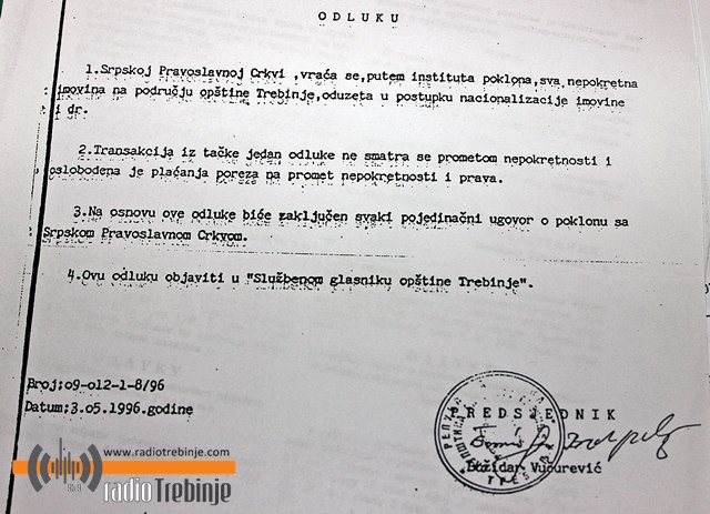 Главни је проблем што је спорни стан, површине 112 квадрата уз 90 квадрата подрумског простора, Епархији додијељен на основу, тврди она, незаконите одлуке посљератног руководства тада Општине Требиње, којом се Српској православној цркви враћа, путем института поклона, сва непокретна имовина на подручју општине Требиње одузета у поступку национализације.