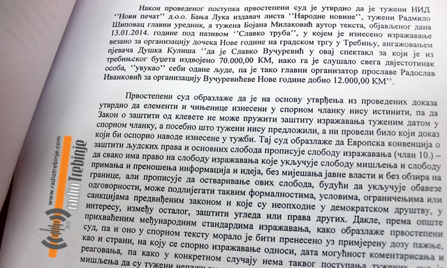 Основни суд у Требињу је „из проведних доказа утврдио да елементи и чињенице изнесени у спорном чланку нису истинити, па да Законом о заштити од клевете не може пружити заштиту изражавања туженом /Народним новинама/ датом у спорном чланку, а посебно што тужени нису предложили, а ни провели било који доказ који би оспорио наводе изнесене у тужби“ Вучуревића и Иванковића.